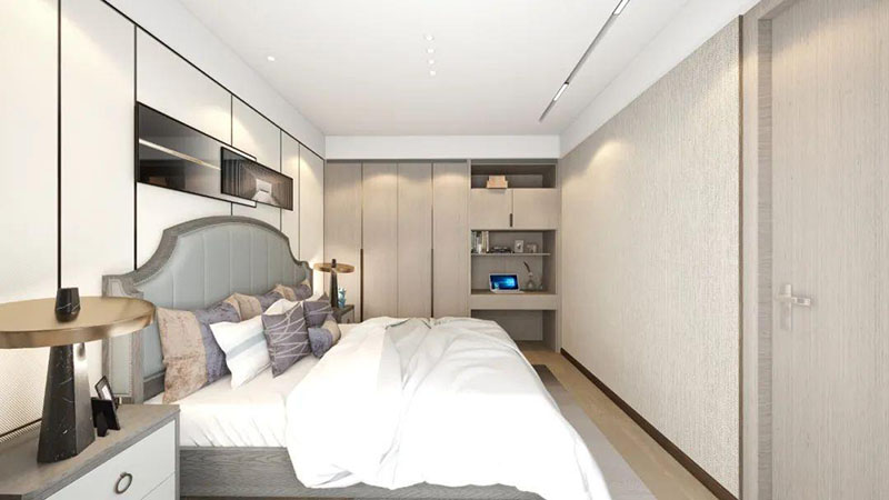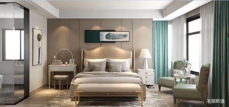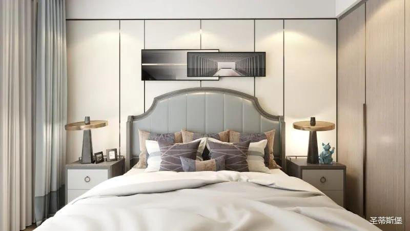 ▲次臥空間主要是以淺色為底調(diào),大面積的莫蘭迪色與淺色相平衡。極強(qiáng)線性裝飾畫帶來的延伸感讓視覺煥然一新。少許的金屬元素?cái)z入,瞬間提升了空間的精致度,將溫潤雅致與時(shí)尚輕奢糅合在同一空間里,每一處都洋溢著浪漫的氣息。