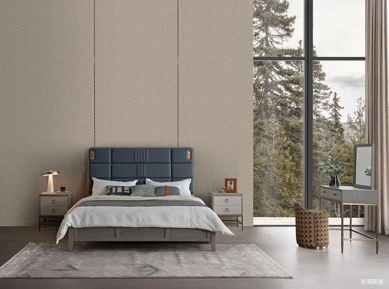 次臥床頭背景沿用了暗色大理石護墻,空間層次分明,簡約時尚的米色床屏糅合金屬鑲嵌與真皮編織藝術,看似舒適隨意,卻在極簡中透著淡淡的奢華感。大面積的落地窗讓自然光傾入室內,拉上與床屏同色系的窗簾,令次臥的室內空間明暗有度。