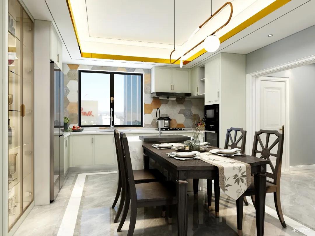 儀式感的餐廚空間,應(yīng)在自然光影中跳躍。從設(shè)計(jì)搭配細(xì)節(jié)將美式開(kāi)放,不設(shè)限的特性顯現(xiàn),實(shí)木餐桌線條簡(jiǎn)約且剛毅,中島臺(tái)鏈接起用餐空間的隨性,不遺余力的拉伸空間的層次感。