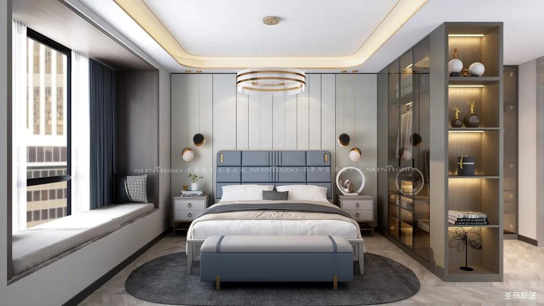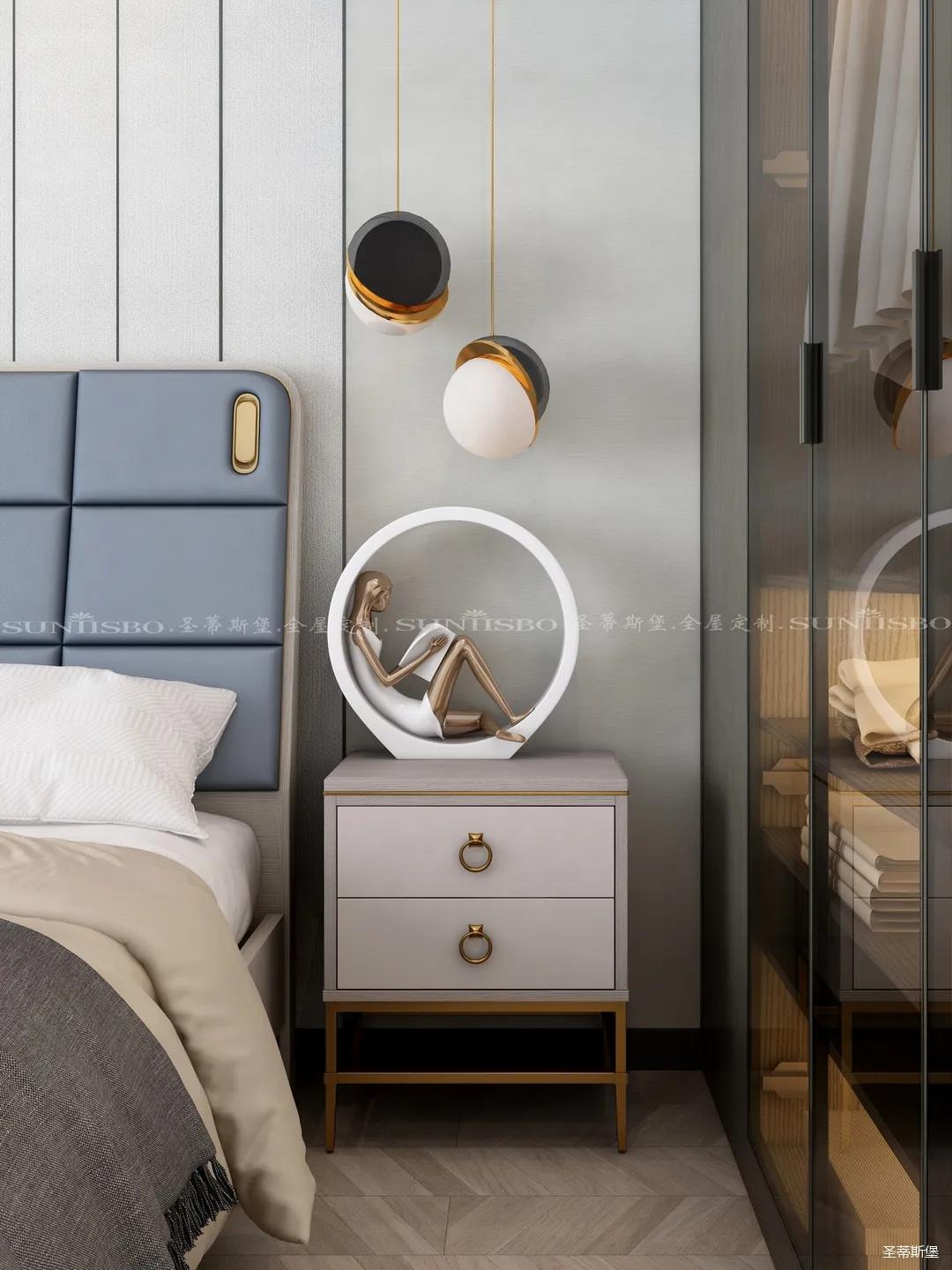 臥室的設(shè)計(jì)繼續(xù)延續(xù)著空間的高級(jí)灰,藍(lán)灰色彩的對(duì)比,讓主臥空間層次感更加豐富,充足的陽(yáng)光隨意散落,空間更加溫暖大氣,對(duì)稱(chēng)的球形吊燈設(shè)計(jì),恍如兩個(gè)“快樂(lè)星球”,展現(xiàn)著空間應(yīng)有的藝術(shù)性,設(shè)計(jì)師巧妙地設(shè)計(jì),營(yíng)造出與眾不同的生活品質(zhì)。