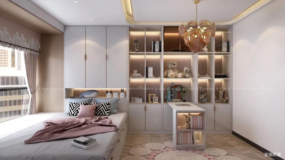 兒童房的主色調(diào)是白色,空間運(yùn)用不同程度的粉色展現(xiàn)出一個(gè)充滿(mǎn)童真的空間氛圍,布偶小熊,別致的兒童擺件都是對(duì)女兒活動(dòng)空間的精選,在燈光的渲染下,呈現(xiàn)出溫馨舒適的氛圍。