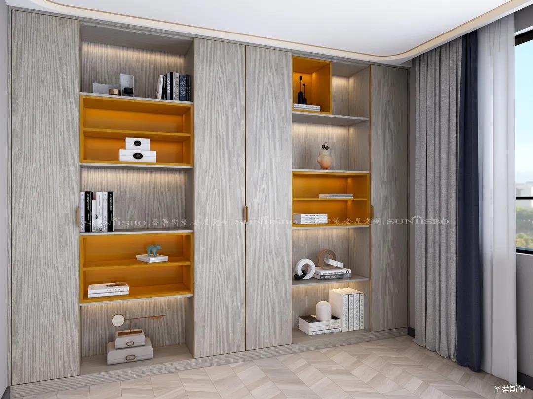 書(shū)柜點(diǎn)綴著適當(dāng)?shù)膼?ài)馬仕橙,除了自身攜帶的高貴氣質(zhì),在聚焦視線的同時(shí),還明確了收納分區(qū)。