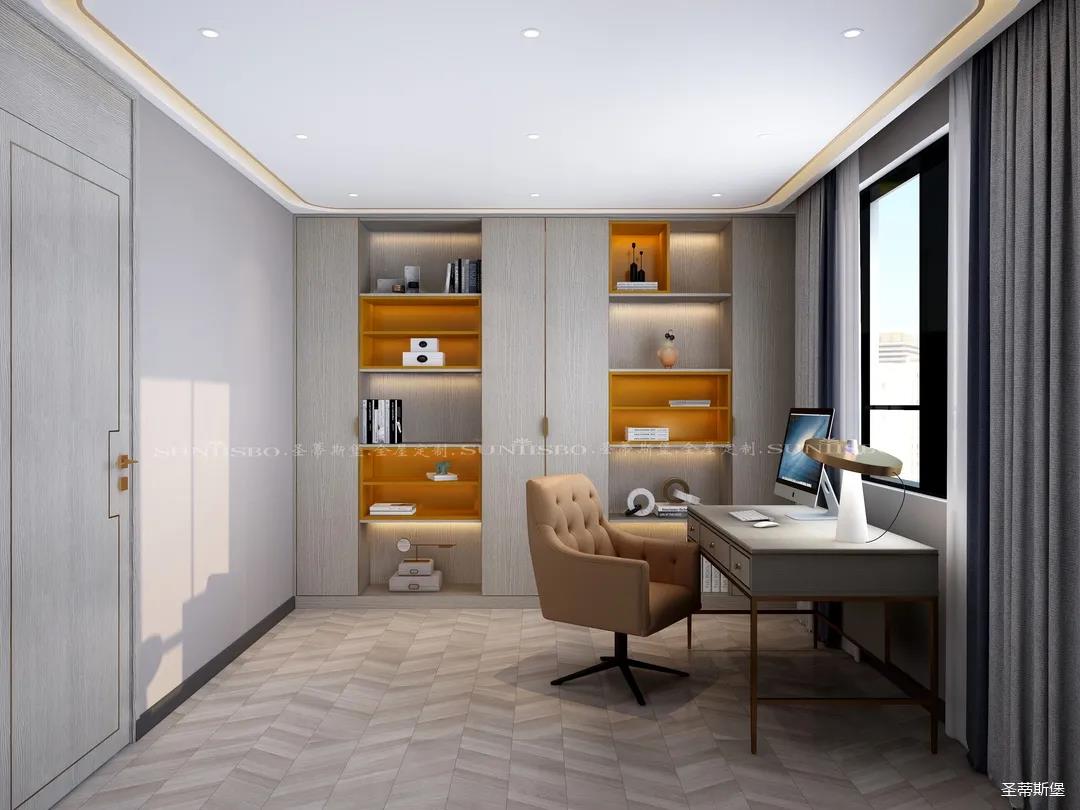 英倫仿古灰實(shí)木嵌墻書(shū)柜,結(jié)合同色系的時(shí)尚簡(jiǎn)約書(shū)桌,整個(gè)空間都被自然氣息包圍。由于工作原因,加班也成為了生活中的常態(tài),簡(jiǎn)約書(shū)房設(shè)計(jì)打破了平時(shí)忙碌的生活,也為心中尋得那一方心靜之地。