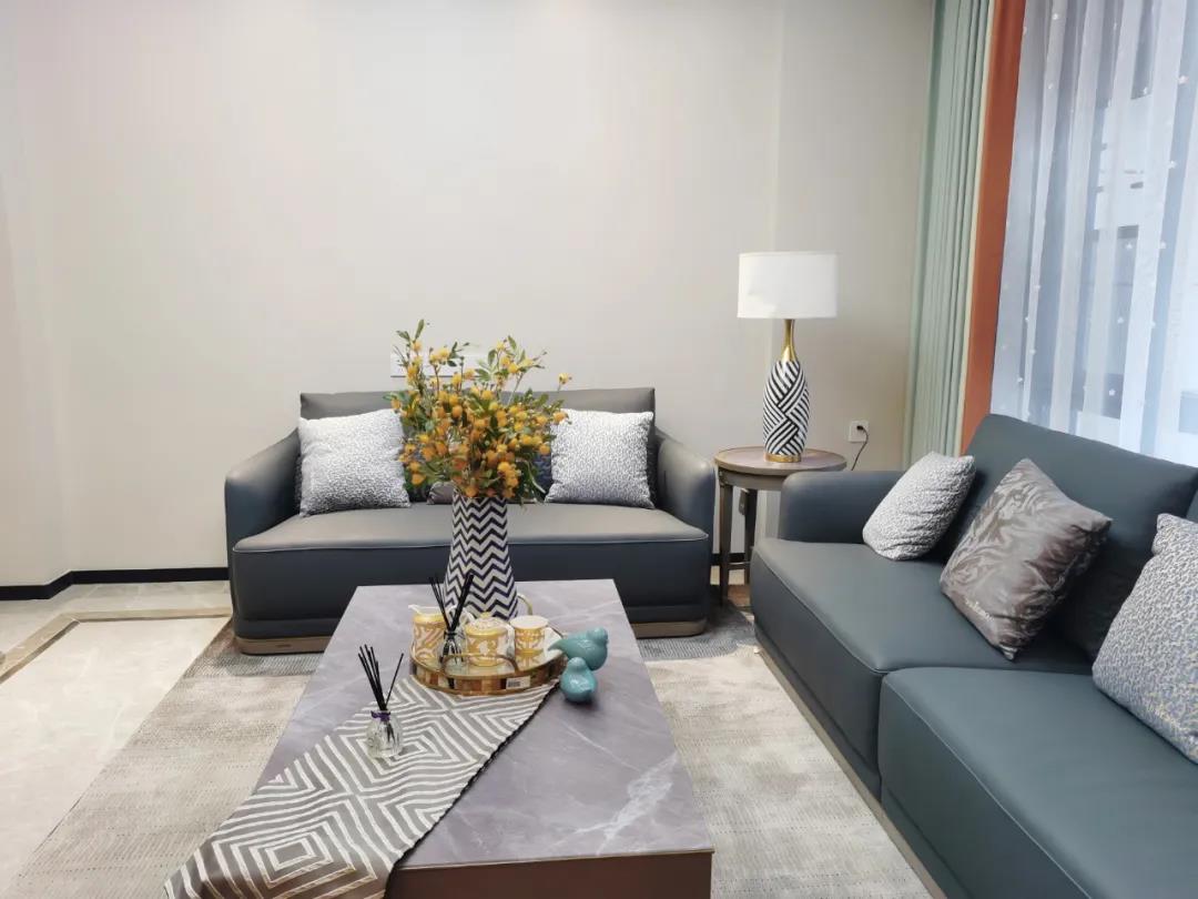 淺灰為基底的飾面與低飽和度的深色沙發(fā)相互映襯,產(chǎn)生強(qiáng)烈的視覺沖擊,深色的家具讓空間從視覺上衍生出一種縱深感。巖玻的質(zhì)感與真皮編織的紋理盡顯現(xiàn)代之美,細(xì)節(jié)陶瓷擺件注滿了空間優(yōu)雅的藝術(shù)氛圍。