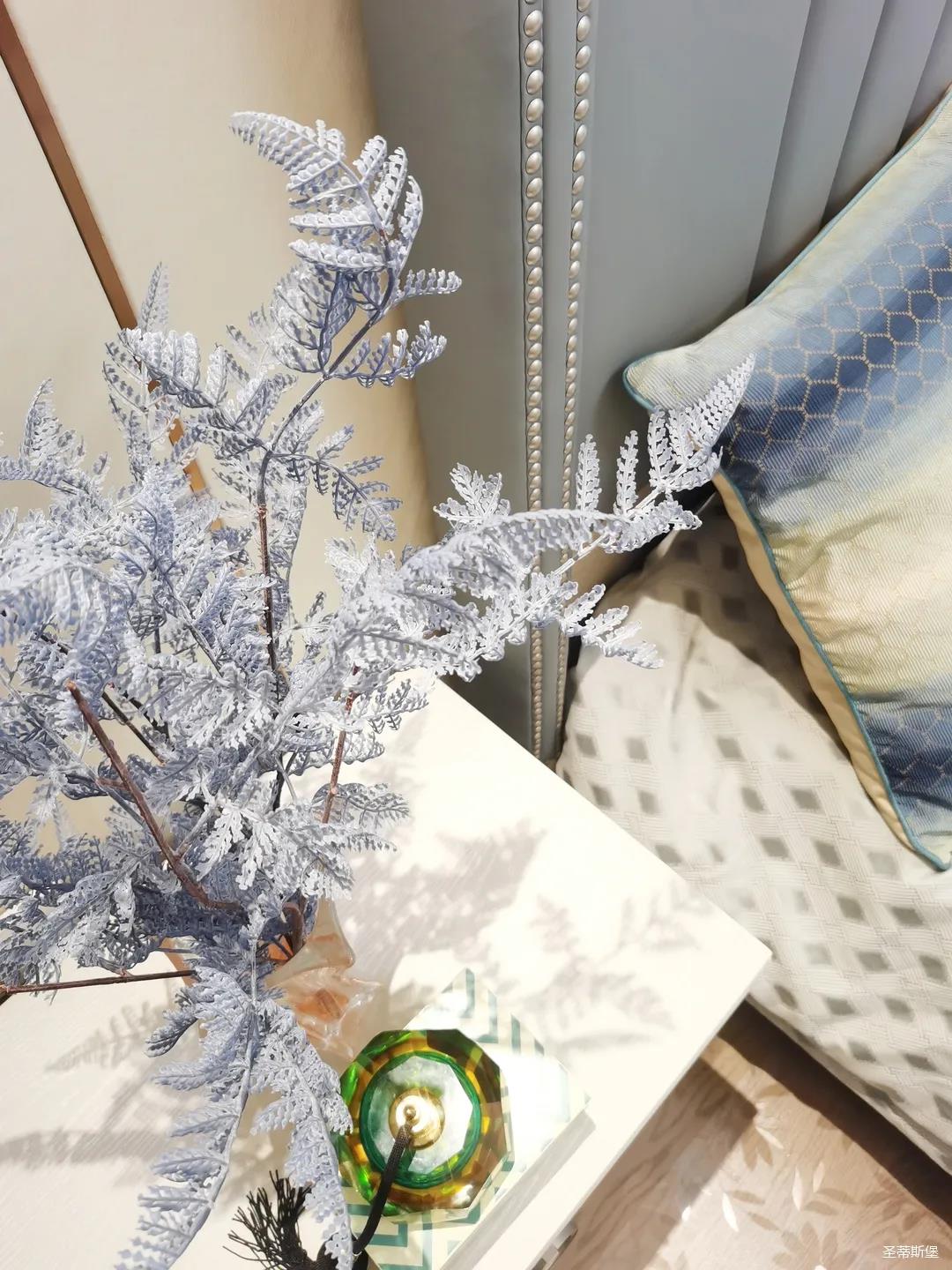 一樓的房間業(yè)主是作為長輩房,采用輕奢的背景墻面,結(jié)合亮眼的金屬線條設(shè)計(jì),空間顯得時(shí)尚又不失沉穩(wěn)。莫蘭迪色的淺藍(lán)床屏,在無主燈設(shè)計(jì)與自然光線的碰撞下醞釀出不同的光影美感。