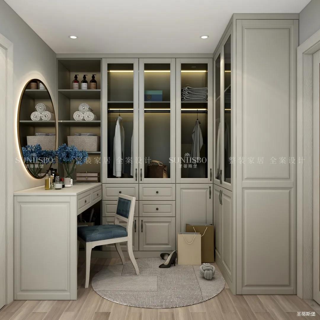 利用主臥多出來的小空間,設計打造出步入式衣帽間。定制了L型的轉(zhuǎn)角衣柜,提供了超強的收納空間。圓形的裝飾地毯與妝鏡相呼應,彰顯著空間女主人對精致生活的態(tài)度。