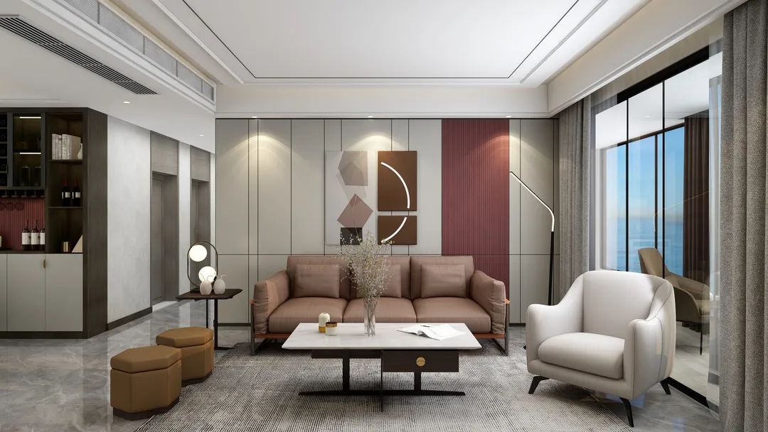 沙發(fā)皮色采用深淺不一的咖色拼接。讓空間顯得精致有質(zhì)感。在沙發(fā)的扶手邊框、底座,融入了愛馬仕橙,讓空間多了些靈動(dòng)的生活氣息。搭配簡約單椅,給人一種視覺上的高級(jí)感。