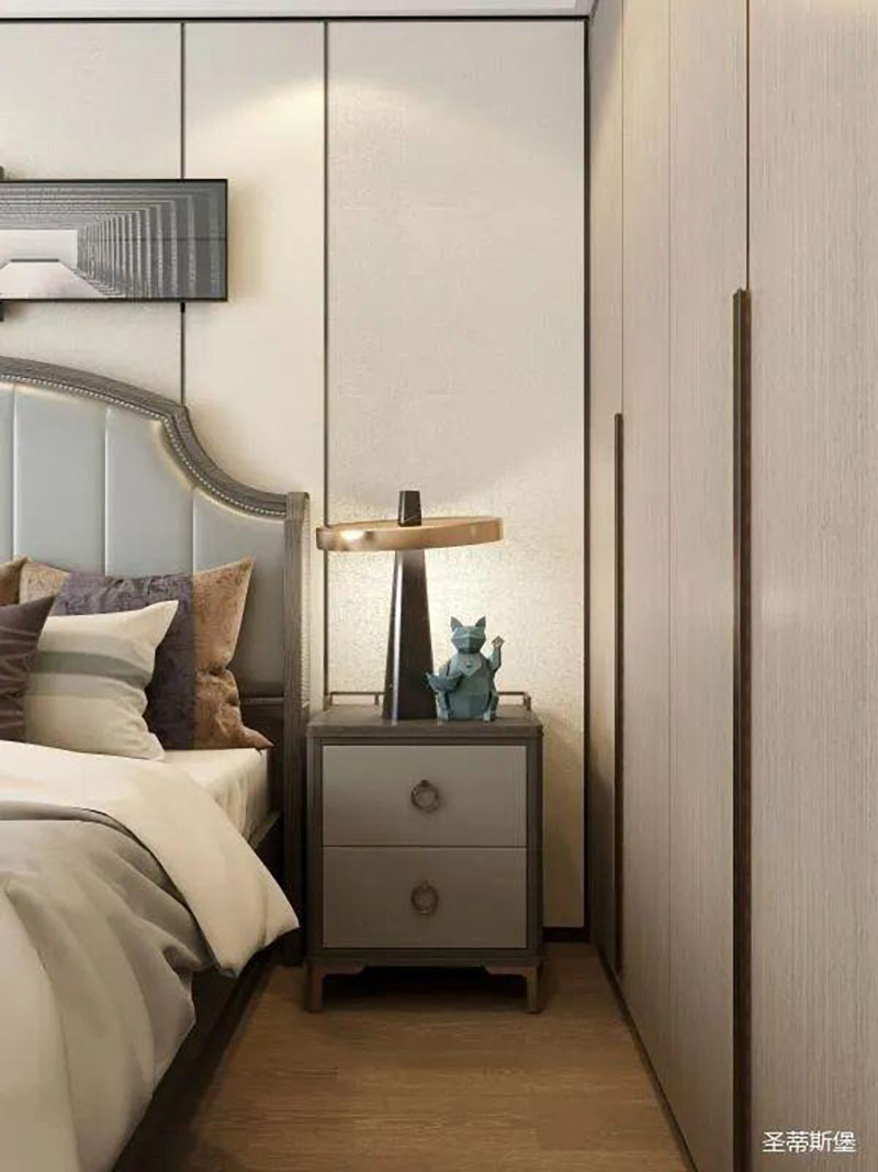 ▲次臥空間主要是以淺色為底調(diào),大面積的莫蘭迪色與淺色相平衡。極強(qiáng)線性裝飾畫帶來的延伸感讓視覺煥然一新。少許的金屬元素?cái)z入,瞬間提升了空間的精致度,將溫潤雅致與時(shí)尚輕奢糅合在同一空間里,每一處都洋溢著浪漫的氣息。