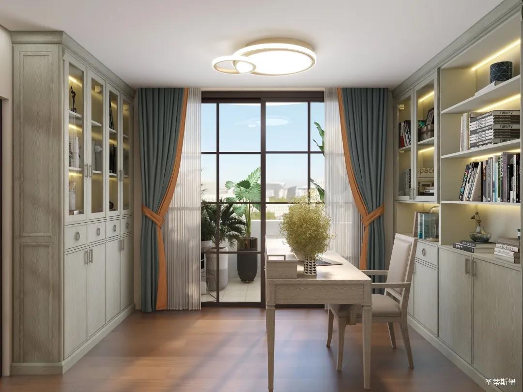 ▲書房設(shè)計(jì)不放過每一面墻,實(shí)木鋪滿整個(gè)空間,親近自然的靜謐感油然而生,陽(yáng)光透過玻璃灑進(jìn)來(lái),落在地面上形成斑駁光影,一本喜愛的書、一杯咖啡、沉浸在閱讀的樂趣之中,時(shí)光荏苒、歲月靜好。