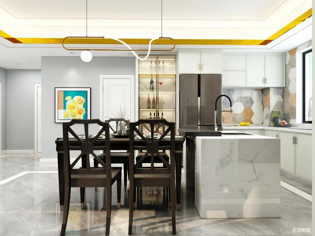 儀式感的餐廚空間,應(yīng)在自然光影中跳躍。從設(shè)計(jì)搭配細(xì)節(jié)將美式開(kāi)放,不設(shè)限的特性顯現(xiàn),實(shí)木餐桌線條簡(jiǎn)約且剛毅,中島臺(tái)鏈接起用餐空間的隨性,不遺余力的拉伸空間的層次感。