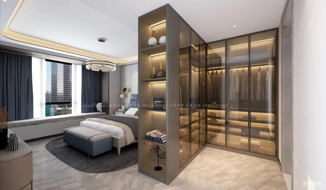 設(shè)計(jì)師不浪費(fèi)每一寸空間,將主臥的大空間劃分出一個(gè)步入式的L型衣帽間,當(dāng)即隔斷了進(jìn)門(mén)對(duì)床的尷尬,滿(mǎn)足了我一直以來(lái)?yè)碛歇?dú)立衣帽間的夢(mèng)想,它不僅是個(gè)收納場(chǎng)所,更是臥室的質(zhì)感體現(xiàn)。