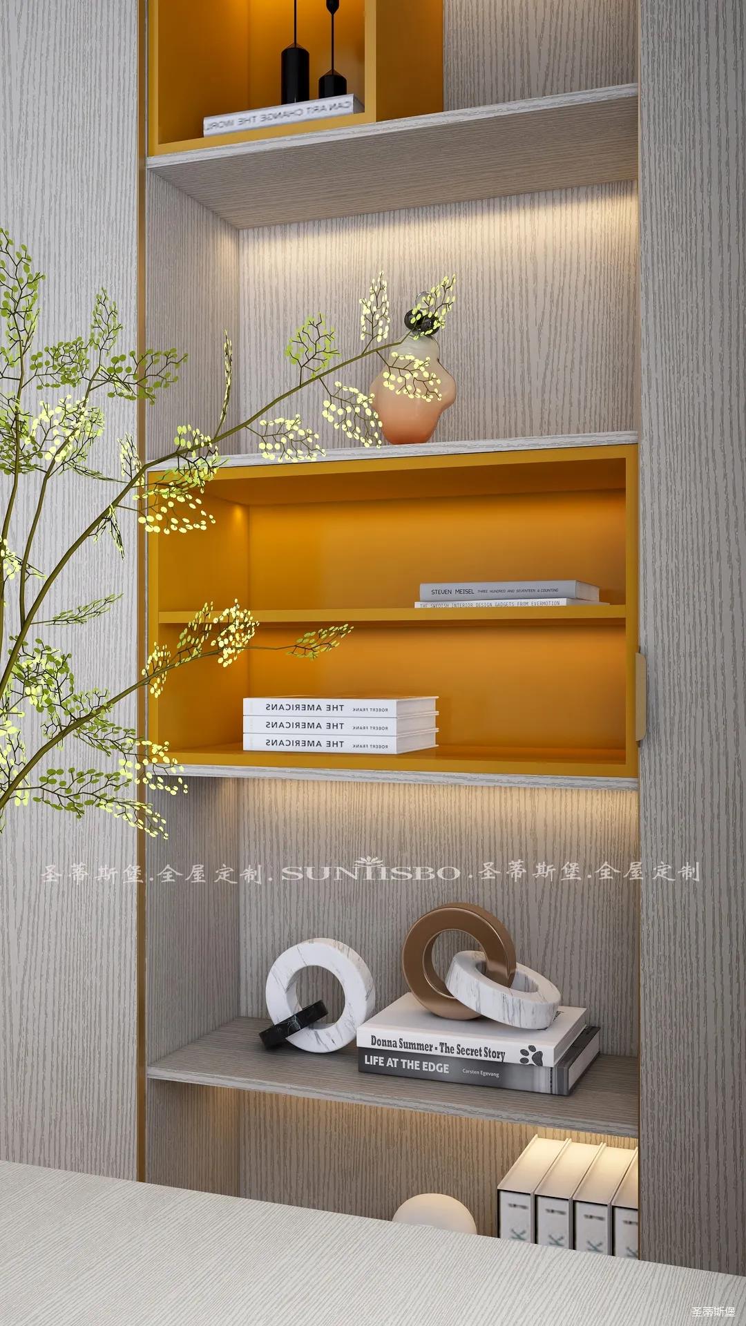 書(shū)柜點(diǎn)綴著適當(dāng)?shù)膼?ài)馬仕橙,除了自身攜帶的高貴氣質(zhì),在聚焦視線的同時(shí),還明確了收納分區(qū)。