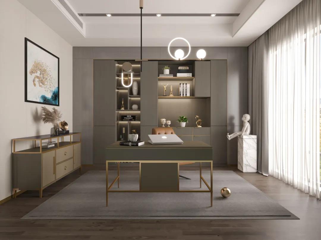 書房用現(xiàn)代手法定制了一個(gè)審美與意境并存的閱讀空間,極具生活儀式感。整體嵌入式書柜,用淺灰打底,深灰為框架,讓身心閱讀片刻沉浸。