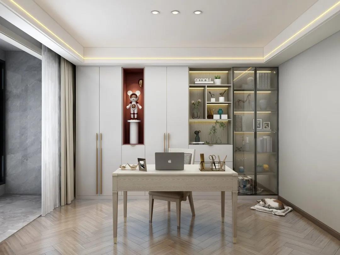 書柜以虛實(shí)結(jié)合的體塊感呈現(xiàn),疏密不一,相異的色調(diào)在橫縱間碰撞交錯,演繹靈動隨性之美,踱入書房,這一隅是閱讀、辦公最好的場所。