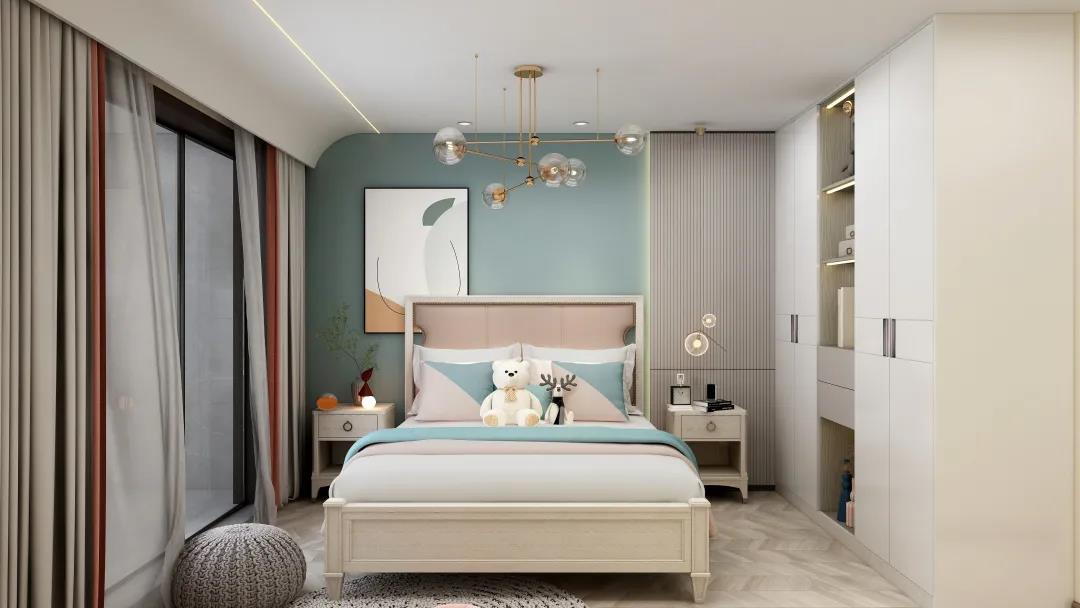 次臥淺灰色的背景墻時尚又內(nèi)斂,入目盡顯舒適的視覺感,為了避免過于單調(diào),特意搭配了與整體保持一致的拼色窗簾,作為空間色彩的點(diǎn)綴。